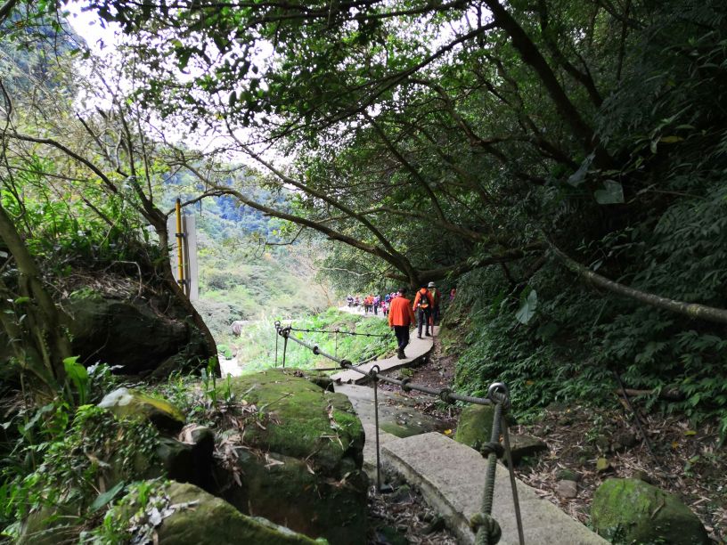 臨走,老闆娘推薦我們去附近一個從未聽過的景點「姜子寮絕壁」。她說了這五個字,我馬上問清楚每個字怎麼寫,這麼美的名字,只要再開車4分鐘往山更深處,廟旁好幾輛大遊覽車,不是為了廟,而正是為了那「絕壁」──走上去,步道開始窄到只容一個人通過,左邊是山壁,右邊是流動的急流;這裡沒有河床,水是在石頭上面跑的,順著大片大片的平划的岩石衝滑下山,那岩石被水長年磨得平平的,一層一層看上去像千層麵;水流從岩縫間找地方流下,右邊有大水流,左邊的也開始有摸得到的小水流,有的岩床沒有水流,乾枯了,連上面綠色的青苔也曬乾了,好像迷你版的山巒模型。這河中有魚,孩子最開心,大一點的要撈魚,小一點的要撈石頭,老人更多,登山仗和雨鞋、整齊劃一的制服,到了路的盡頭,果然到了最美處,這裡的山壁不再像台灣,而像越南下龍灣或廣西桂林那樣的高聳岩壁,最上面突出來,上頭有樹,樹有藤蔓垂下,於是就有一些水流順著那些藤蔓,源源不斷的像流口水一樣的,從山崖最上頭直直往下注進了、正在從左往右急沖的水流中,這裡建了好多大理石椅子,有情侶,有小夫妻,有老妻,有一家子,都在這裡欣賞著,人聲比水流聲大,有人吃棗子,有人吃蘋果,有人吃零食,你專心的拍照。