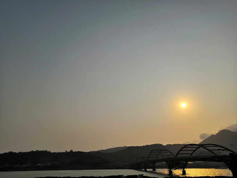 喝一口飲料我們立刻就戴起口罩,直到喝到下一口再掀開口罩,即便在海風吹撫的空曠處,我們仍不掉輕心;我都抱著「下次說不定就禁足、無法出門了」,慢慢的等夕陽,慢慢的等,結果它總是比想像的還快,很快的我們就等到了5:30 ,你看著APP說再過半小時6:05就夕陽下山,沒想到,到了5:45,太陽就消失不見了!原來是霧霾太重,太陽很快就降到霧霾之後,瞬間提早天黑,終止了海邊情歌,氣氛不一樣了;從VIP座高高在上往下看,遊客不見了,剩下一桌是老闆全家人和兩隻狗,男男女女大人小孩自在的散坐,他們的家就在這,沒地方去了,夾在中間,這條跑滿砂石車的產業道路,漲潮的海水拍打著石頭,他們痛快地喝酒吃肉、聊不完的話,我和你則被一大群黑色小海蠅纏著,提醒我們該走了。