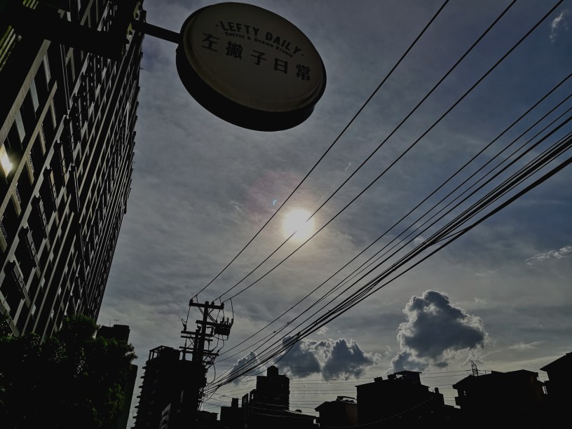 「左撇子日常」非常小,為了提供合理數量的座位,座位只好擠,它拿鐵和蛋糕與可頌麵包等還不錯,最不錯的應該是「人」的氣息,在冷氣中是有味道的。坐我們左右的全都是女生,有長得像男生的女生,像運動員的女生,像大媽的,都是文藝氣;有拿出《聯合文學》在討論的,有翻開Macbook蘋果電腦在敲的,反正,在汐止這個台北之角,只要有這樣的一桌,其他的桌大概都會評這地方4.5高分了。外頭有點暗,原本以為應該是要下雨了,才意識到今天有「日偏食」,妹妹聽老師說那是幾百年才一次的(後來她解釋台北只看得到偏食,日全食要到南部看,有一個同學還請假去看)。我沒在看新聞,完全不知此事。我們跑出門,站在門口看天空,不只我們,路上大家都停下手邊的事情了,一對一對的,機車也停了下來,行人停在原處,對著太陽,大地變得有點暗,打下來的光線似乎帶著黑色素,非常詭異,才知道原來我們太習慣太陽光了,以為光就是那樣,其實光暗了一點,大地就不同了。到底太陽光被遮了多少?他們說,今天這顆太陽已被遮了80%,戴幾層墨鏡可看得到太陽只像彎月一條,要遮住這麼多的陽光,才會出現這種「黑色日光」。太陽無法攝入相機了,這「黑色日光」更只能靠大腦能記多少就記多少了。
