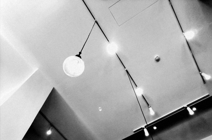 這間咖啡廳設計得像Apple Store蘋果商店,一張大桌,正敲著老IBM電腦的男子已經佔了一角,我們則把大桌剩下的五、六個座位全都收了,我坐的位子、這個木長凳子乾乾淨淨的,和所有東西都成直角;我的背靠著乾淨無暇的木牆壁,屁股坐在水平的木長凳,我的手臂靠在水平的木色大桌,背景音樂一直都是類似健身房的快節奏,像我家兒女偶爾愛聽的,身體不自主左右擺動,然後再專注,做一陣子,又跟著搖動一下,大概是因為週五,氣氛特別高昂。