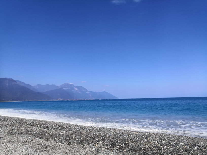 在花蓮,山的長相和台灣其他地方都不太一樣,非常的近,非常的高,仔細看的話,山腰處的空中竟停著一架正在打槳的直升機,直升機機體這麼大,為何現在看起來這麼小,可見,天氣太好,它其實在很遠處,我們仍看得很清楚。因為將遠遠的高山都看成好像就在眼前,這樣的地方會特別讓人覺得自己好渺小,這時候右手邊出現了七星潭(原來是海,不是湖),海水是藍的,完全琥珀的藍色。還以為是因為很早才看得到這種類似17哩海灘的海水顏色,沒想到,這藍色一直到了下午都是。