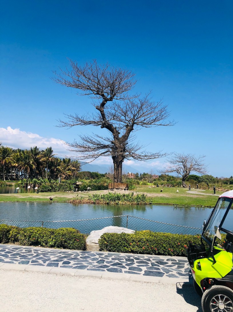 還好我們租了時速13公里的電動車,最快可到20,載我們看海,沿著花蓮溪,鮮橘色的台灣巒樹,孩子們一人戴一頂鮮黃色的小小兵鴨舌帽,路邊看到一隻白色的小鳥。我們一家分乘兩輛車,我們這部由你開,這裡的石頭是大顆的,每一顆都像是洗過再擺上去的,好白好美。天氣好,草皮又剪得短短的,路彎彎的,往外看是和昨天一樣的寶藍色太平洋,如果沒有鋪這種草皮,就不會這麼的整齊漂亮,所謂的漂亮,是一半天然,一半也要知道怎麼人工去配合的。你很滿意這段,你說原本以為只是看關著的動物,你不喜歡看到動物被關著,後來開了電動車才覺得「哇」!後來我們特地繞回來這裡買「蛋蕉」,比芭蕉還更小的香蕉,原本不想吃,第三排我們一人一根,太好吃,多要兩個。
