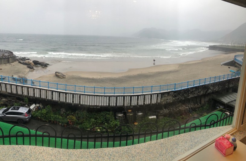 綿得像細針的海邊細雨中,開車十幾分鐘,就到了吃中飯的地方。弟弟時間控管得當讓我們成功順利的在十一點半左右抵達這裡,一開車門,就聽到大海在吼,果然如其名,這裡是「龜吼」,是一個小漁港的名字,名氣被旁邊的野柳給掩蓋掉了。這家海鮮已分家,成大哥店、二嫂店,我們吃大哥店,門口的車聲又比海浪更大聲,這是一棟窄樓,一層樓只有一大桌、兩小桌,我們這大圓桌讓我們從二樓透過大窗、直接看盡了外面一片灰色的大海、掃不完的急浪,視野左右極寬,就看到了這裡有一兩條浪線,那裡又一兩條浪線,不同步的在海上「折磨」著幾位穿著全身黑色衝浪衣的玩家,一度為他們緊張,但他們就是為了被海浪折磨而在這裡的,整個怒海就只有他們幾個小點點,沙灘上也一個人都沒有,頂多一隻同樣全身黑的瘦土狗悠悠踏步。妹妹和小姪女看著發呆了。孩子也習慣和我們這樣吃飯了,中間圓盤轉呀轉,吃完後,下樓梯旁邊的牆上貼著老闆娘和各藝人合照,照片竟有張曼娟,哥哥看過她幾本書,我趁此話題說以前在矽谷曾拿給她八九本書簽書,後來在某個有總統的場合見到她,她完全沒印象也不和我這個小粉絲多說話,令人難過。現在想起來,應該是我自以為自己身價有多高。