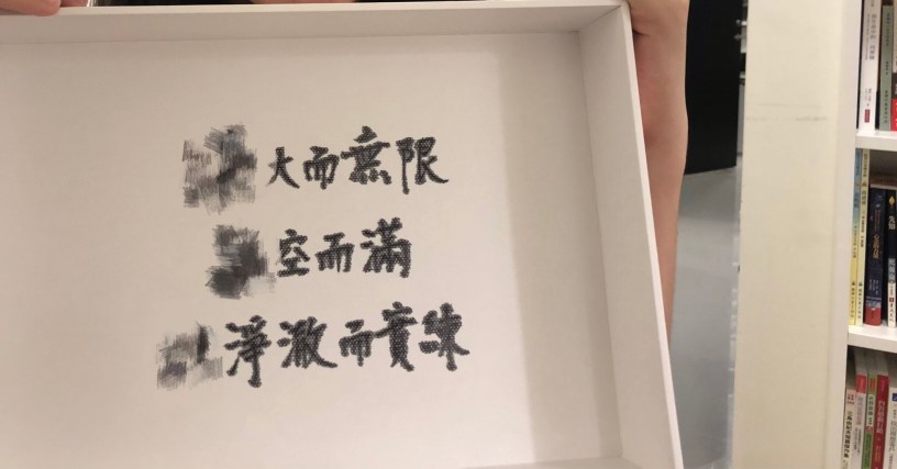 以毛筆字寫了一句:「O大而無限,O空而滿,O淨澈而實練」,相當滿意,「O」處是家裡三個小朋友的名字(我家哥哥妹妹、他們小姪女),名字各取一字,各有其義,義再翻轉。