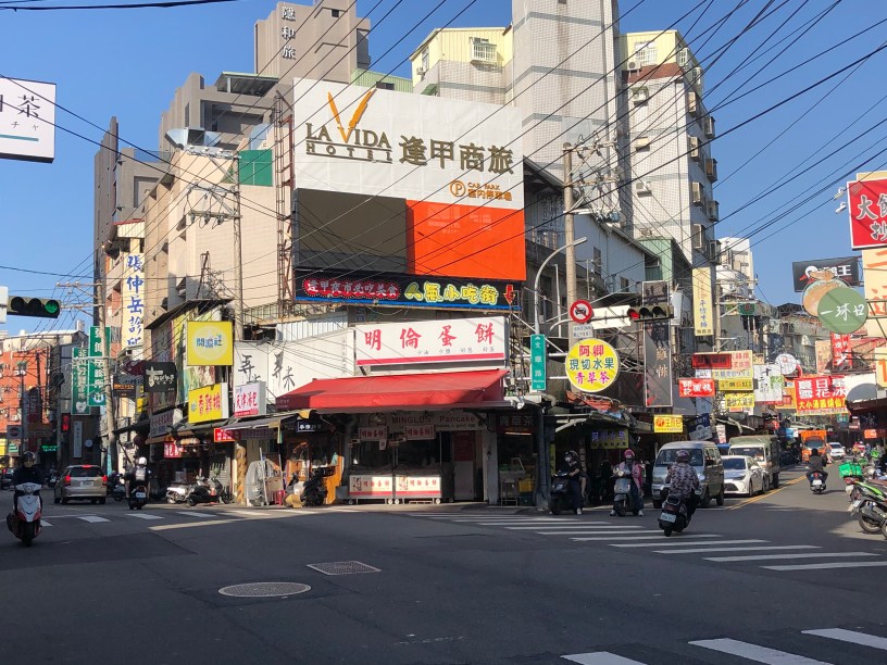 高鐵列車帶我們來到晴朗的台中,台北已是晴的,但台中更熱,已經換成短袖,在旅館的大廳,吃豆子,旁邊有一間非常非常小的素食店,店裡唯一客人是自己來吃的年輕太太,趁老闆娘轉過頭時暗示我們叫便當比較便宜,一個才60元五道菜,有一道用梅菜扣肉的做法弄素料,當然我們後來到晚上才走到這附近的逢甲夜市,人不多,足夠的空間讓我覺得脫下口罩吃幾口再戴回口罩,方圓5公尺內是沒有其他人的。我們第一道是沙茶豆芽菜,吃了五顆炸得非常酥的臭豆腐,然後是「明倫蛋餅」、「逢甲潤餅」,