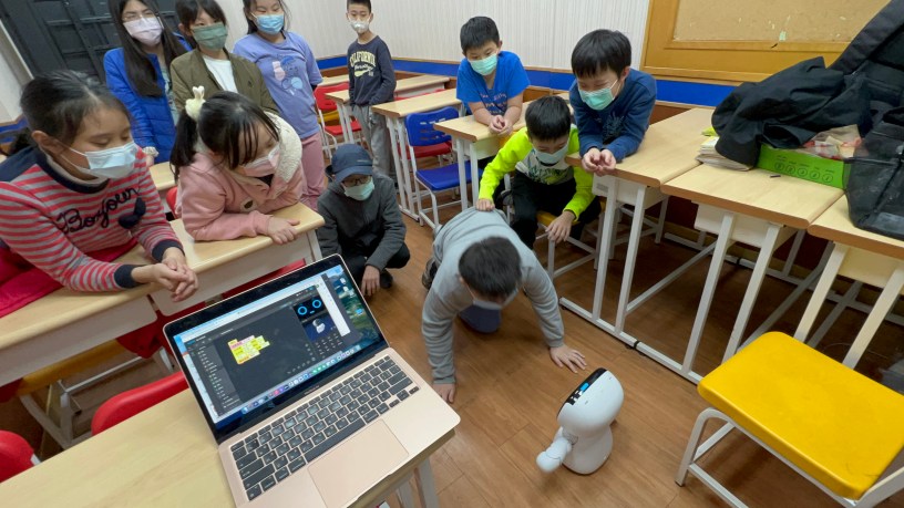 早上下午都有課,都是新班,面對全新小朋友,這次我還算非常輕鬆的投入,並不急著進入程式本身,反而重視與孩子互動的內容,一步一步的和他們說明什麼是程式、為什麼用機器人,我問小朋友,家有機器人的舉手,大概有三分之一舉手了,再說:「是掃地機器人的請放下」,全部都放下手了。我開始說,三十年後每家都有一隻機器人,有的會有兩隻,一隻在客廳,一隻在房間,孩子們第一個反應竟是:那一定是給有錢人家的,自己一定買不起!我強調,我們都還是在「實驗室」,一切都還在研究中,所以不能笑它(因為我預期等一下一定又會bug滿天飛),然後,我開始在小朋友面前寫方塊程式,像機器人跳舞、放屁,小朋友開心;然後我讓機器人聽辨聲音,小朋友自己錄回答,但機器人的手與頭竟不靈敏,猜數字完全沒反應,以前都會覺得自己很丟臉,現在知道,會不會丟臉,要看自己覺得自己丟不不丟臉。再丟臉的事,只要自己站穩了、自己不覺得丟臉,其他人也不會看出你丟臉了。不過,講了50分鐘,我已經完全沙啞了。