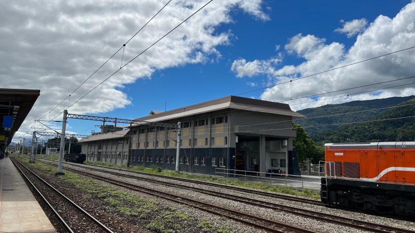到了「玉里」,下車以後,紅色普悠瑪號離開,突然,天地,豁然開朗,暖了,好暖,外套脫了,帽T也脫,但又沒有很熱。還沒下月台,就先請等待的年輕女生幫我們全家拍一張,然後妹妹開始對著空空的鐵軌拍照,先拍了燈管,再拍了旁邊的廠房,第三張是紅色的火車與天上的藍藍的天,沒有調色,就好漂亮了;哥哥因為沒有衣服不得已穿的毛衣,脫下換回短袖。