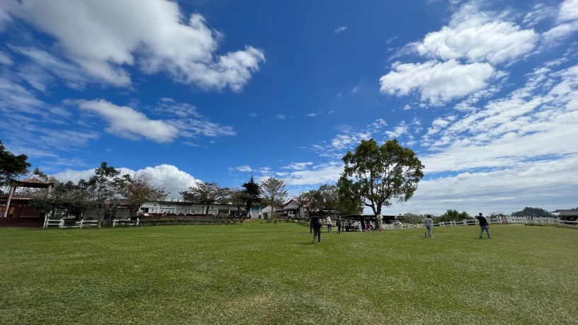 兒子選的初鹿牧場,選得真的很好,一大片的草皮,又是一樣的藍色的天空,陽光剛剛好,熱起來了一陣子以後它就暫時躲到雲後面一陣子,樹木在路旁邊形成兩排,稱林蔭大道,這視覺很美麗,我們一家拍照,爸爸的腳架和搖控拍攝器很有用,不求人拍,只求自己家孩子配合一下嘛、再拍一張,三個孩子也真的這趟旅行都很配合著拍,嘴裡抗議但還是都拍了,拔口罩、看鏡頭、笑咪咪、做鬼臉;這裡有動物,有羊、小白兔、和小馬,最多的是羊,大小都有,各形各狀,拿牧草餵。動物的存在和吃的食物一樣,給孩子重要的記憶點,特別是「氣味」,孩子說,站在某處,一直聞到「羊肉」的味道,有盪鞦韆,路上還有「美食快餐車」就跟迪士尼樂園一樣。今天是週日,整個牧場都是人,坐在木階上,欣賞前方的大山,被陽光照著很清楚的一根一根的淺綠色的樹,北美洲也有這種山嗎?我想,不缺的,但耳邊都是人們的聲音,時時刻刻都可以看到其他人,一整天下來已經擦肩而過可能有100組的家庭,且都聽得懂他們在講什麼話……這是只有在這個小小的家鄉才能有的好環境呢。