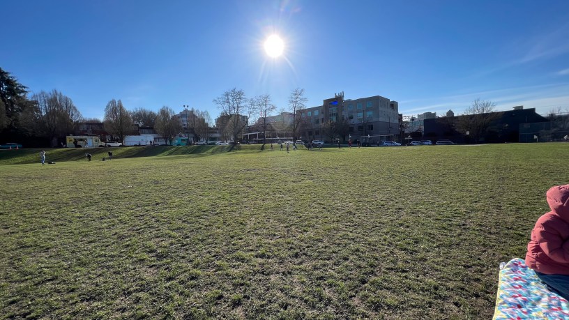 終於讓大家都有得吃,來到今天野餐地,一家叫Roger的公園;想像一座接近市中心的公園,這公園和我們住的地方、溫哥華處處都是,以一大片什麼都沒有的綠色草地為主,人工設施不多,但Roger公園特別的熱鬧,的確,網上評價就高達幾百筆,很多人都愛來這裡,這些人,沒有華人,全都是白種人,至少十組人,坐著野餐,有五組則坐在木椅或木桌;年輕人在這邊踢足球,一群都是十來個,有男有女,說話客氣有禮,另一組男子在玩一種丟木塊的、我看不懂的團體遊戲;有人帶小孩過來,也有情侶,大家已經做到防疫的安全距離,我們仍設法找到了一處位於草皮正中間、離其他人更遠的的,毯子一鋪,打開兩家速食店買來的薯條漢堡大嚼特嚼,這種陽光是,只要陽光沒照到、被陰影擋住(即便是我們自己的影子)就會變好冷,向來不怕冷的兒子竟冷得發抖,第一次穿上我給他的外套,變成我在冷;但看到兒子不冷,自己又沒這麼冷了乎。此時發現旁邊也有餐車,西班牙菜,點了一份海鮮燉飯,老闆是整個場域唯一的亞裔,飯很入味,蝦子很大,每口都很好吃;離開後才知道,這公園的強項之一是「夕陽」,我們來不及看,只待了45分鐘,我們停車卻設定2小時。