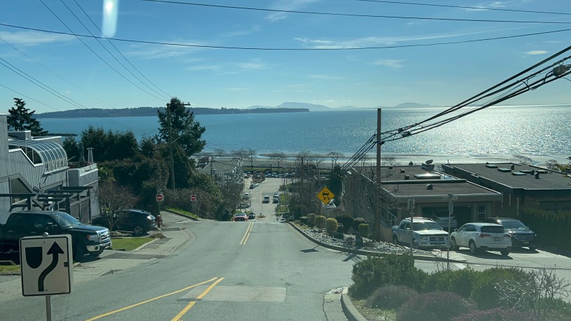 到了White Rock白石鎮,往大白石開,得經過比舊金山的路還陡的斜坡(路牌上寫是20幾度的斜角),抵達海邊,竟塞車了,所有沿著海灘的停車場都滿的,還有車子在等,濱海路上(從寬度看應該稱它「巷子」)也全是車,但都很有禮貌,沒人急躁,旁邊的餐館,各國的都有,還有冰淇淋店,老外一群一群的,沒戴口罩,這畫面應該是比Santa Cruz的海灘還要多人了。結果,我們無法停車,竟然沒得看到大白石,心想也好,孩子在車上已經透過網路把大白石的歷史都看過了,也知道它是後來才漆上去的。