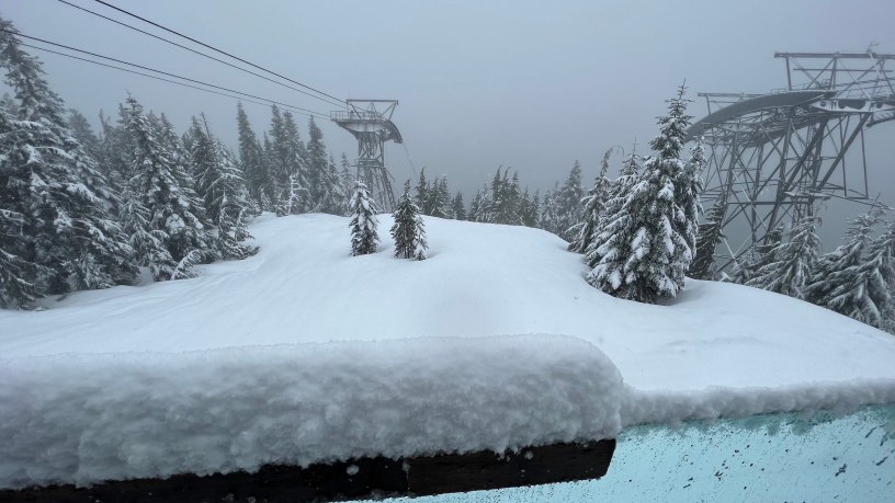 好吧,今天要出門,凡事往好的看,我們要求我們家哥哥今天這麼想去Grouse Mountain就要七點起床並叫我們,他真的做到了!於是在7:40左右,真全家一起出門了,外面是灰灰的雨,今天還有下雨特報,往北開進山區,大馬路都還有兩條線道,正因為下雨,今天人特少,沒有人會想在這種天氣觀光上山,於是,應該也比較少人沒有戴口罩吧?停車場就在山林之間,果然只有一小批車輛,應該就是定期熱愛滑雪的,車子停在那裡好久,都沒有新的車輛進來:我們停在停車機器的旁邊,剛好看到一台纜車上去,好安靜好安靜的,在鋼索上面滑動,車身鮮紅色的。你幫我們帶了一人一把雨傘,這種雨對台灣來講還好,學老外不撐傘就很辛苦,但一撐傘,就變得很輕鬆。