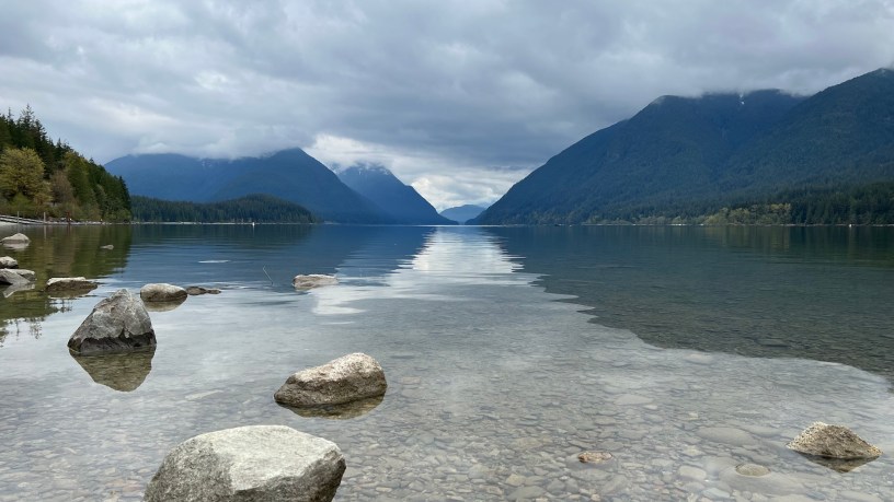 看起來並沒有特別應該去哪一個景點,從門口進去,一條路就直直深入到森林,樹都是好幾層樓高,地圖顯示開始繞湖,從湖的南端到西端、繞四分之一個湖就需要30分鐘,不想走這麼遠了啊,還好中途看到一個小小招牌「To Beach」,終於可以親近湖,這湖,比上次的Buntzen Lake漂亮,光線從前方湖底的兩座山中間投射進來,在湖中間形成了一條光廊,一路延伸到我的腳邊,而腳邊是清澈的、完全沒有雜質的湖水,輕輕的水聲,打在一顆顆橢圓的石頭上,這是天堂之路。
