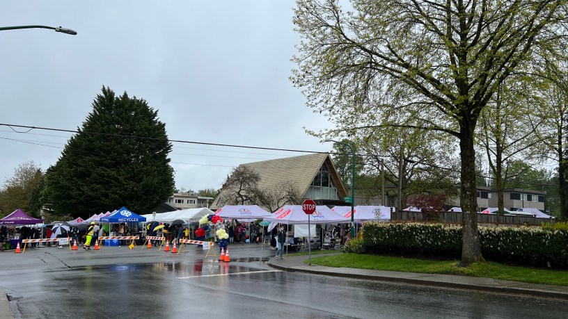 趁今天結束前出門到溫哥華東邊邊界處、一間好像是教會改裝成的某種道教的禮堂,在尖尖的屋頂底下,供奉著一些神明。今天重點是這建築外面的「街市」,到現場嚇一跳,政府竟為此「封街」,下午兩點,人非常多,滿滿的擠在純白色的大帳篷下。周邊都是住宅區,已停滿了車子,路上有這些應該是華人家庭牽著青少年或小小朋友,剛停好車,慢慢的往街市走,也有剛從街市買了吃的,一邊走一邊吃。連旁邊的星巴克,裡面都坐了一桌三個台灣媽媽。我們後來不想排隊,所以沒買到台灣小吃,只買了一些餅乾(像科學麵,一包1元加幣)。