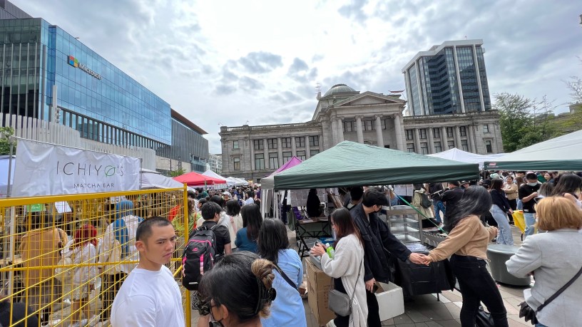 今天這日本市集,位於溫哥華的美術中心,經過看到全部都是人在排隊,都覺得自己被騙了買票,但是,停車在Pacific Center第二次,跟著電扶梯上來到媚豔的陽光裡,很快就走完,竟覺得意猶未盡,妹妹想喝抹茶,我們不畏長度排隊,後面剛好有一個穿著日本武士裝的洋人和他華裔的女友一起與我們排隊,有路人要與他拍照,他也不收費;人很多,怕的不只是病毒,也怕有人又拿出大規模殺傷武器,不過,一邊提防,一邊看到這地方真蠻特別,前景是市集,後面背景則是百年古蹟美術館的石雕建築,旁邊又是一棟玻璃帷幕辦公樓,「微軟」的logo掛在上面,旁邊更高的大樓掛著TD銀行,我們一行在走道旁邊的樹蔭下,坐在木板鋪好的座位,涼涼的微風,再經過一行黑衣的華裔年輕人,在抗議香港事,我們找一家泰國的餐車買了Pod Thai走到旁邊UBC分校的大片階梯,下面有三男一女年輕人在練街舞,他們好像輪流說故事接龍,用機械人般的肢體動作和旋轉、忽上忽下,像沒有骨頭似的,沒幾下就整個人已經躺在趴在地上,又突然間起身,手勢裝作眼睛。「啊!他們發現了!」旁人驚呼這劇情編得真好。