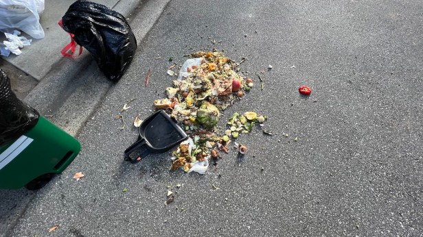 今天早上是垃圾日,而且還要清兩週才一次清掉機會的黑色垃圾,以前都是晚上弄,現在都延到早上才弄,大概只有15到20分鐘;偏偏今天的廚餘袋,採用超大型的,只有一個,從冰箱拿出來,下方已經濕掉了,我早已用一個防水塑膠垃圾袋將它包著以免漏出,之前和這個超大垃圾袋已在冰箱與我們「相安無事一星期」,今天早上將這一大袋垃圾袋提出門,到了門外(還好是到了門外了)突然整個「垮台」、「掉底」,所有的廚餘,就這樣子,毫無保留地,全都滾到了車道前面的柏油路上,還伴隨著濃濃的廚餘味,也被早晨陽光立刻接收了,陽光晒著垃圾,將臭氣揮發的更大!哇,怎麼辦!