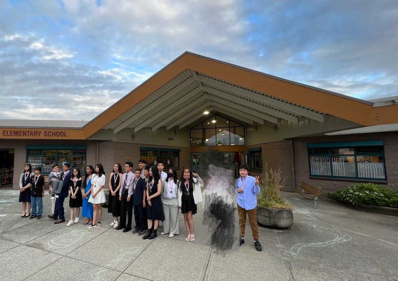 熟悉的校園,不熟悉的裝扮,妹妹的同學都穿著正式,男生穿西裝領帶,女孩也穿全身套裝。大家都講同一題目:什麼是leader,我聽了一輪,都是講,在學校就幫老師忙,當Tung’s tutor,參加Kinda-care帶幼稚園小朋友安全回教室,幫忙學校圖書館拿回借書,還有Crossing Guard交通隊…到外面就參加food bank──這有一個基本的錯誤(也是一個以後孩子們可以鑽縫的機會)就是「leader就等於義工」,應該說有一塊不一定要當義工也能做leader,而有一些義工根本就和leader無關。他們都會說,以前都以為leader是可以當老闆或總統,才發現其實每人在自己崗位就是leader了;什麼是leader就是WSOAR,好像是他們學校的幾個宗旨……幾個人念了學校口號:「once an eagle always an eagle」。