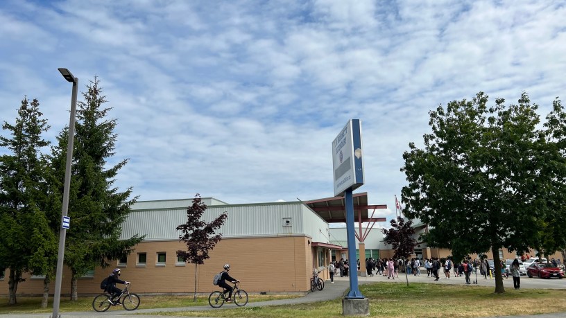 哥哥先去,妹妹還在家;我帶著溫哥華太陽報上車一邊讀,上車後我就告訴兒子他念的這一間就是爸比(我)小時候唸過的暑期學校,一模一樣的同一間;我還記得那四四方方、倉庫般的校舍,一整條沿著路蓋的,下一個記得的畫面就坐在教室的大學椅裡,和一群不認識的同學,好像去其他學校教室考試,暫時的,不以為意,又是暑假,上完課就回家,很輕鬆;我特別告訴兒子,暑假學校也有一些留級生來,且這間學校聽說是Richmond中比較差的,要小心。哥哥早上吃A&W的漢堡,他還沒吃完,我們就到學校了,外面已站了一大堆人,像菜市場的,不知為什麼人都卡在那邊;兒子在車上折騰了一下,才下車。