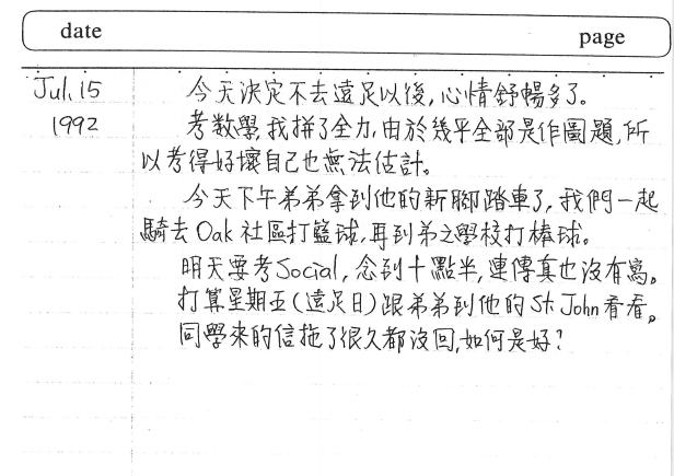 15歲正在語言學校念書的你,依舊最在意的是是否參加學校旅遊、新腳踏車、然後是球類,棒球、籃球。你知道嗎?這個Oak社區,是當時最靠近我們的籃球場,但後來在我們那個社區也建了一個更新的球場與網球場。我的女兒,特別喜歡這個籃球場呢。而Oak那個籃球場,至今未變,一邊高,一邊矮,而當時一陣子常和我們一起打球的弟弟同學的爸爸,球技很花俏,現在已經因癌症過世了。