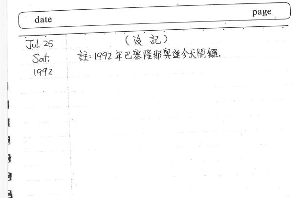 沒錯,又沒記了。這是第二次沒有寫日記,不過,謝謝你,至少註記了這一天是巴塞隆納奧運的開幕日,我記得那次的點燃聖火真是史上最經典,採用射箭的,大家都摒聲息氣的看,點燃剎那全場歡呼,我到現在還記得那個因轉播畫質而有點糊糊的畫面。