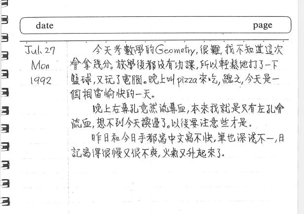 以下是30年前的今天(7月27日)你親筆寫下的日記,那時候的你和現在的我是在同一個城市,住的地方只相隔大約三條大路。那個時候你住的是爸爸買的6間房間的4000平方呎的獨力屋,現在,我住的是租來的3間房間的1400平方呎的城市屋。