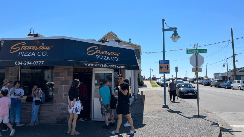 停到車位差不多11點多,再等一下下就是11:30,那間街角的披薩店就開了。點了兩塊12吋pizza,大約和達美樂差不多大,一個和達美樂差不多600元台幣,另一個高達1400元。後者就是我們上次吃過的,確定有蟹腳、大虎蝦、醃鮭魚,疊高高的。另一個則真的令人驚艷,有鮭魚肉,蝦子也是在pizza上躺得滿滿的。我們在車上享用,一下子開引擎,一下子打開窗戶,這是一個好車為,旁邊來來往往的車輛一直停住問我們是不是要走了,但看到我大口大口的戴著塑膠手套吃pizza,表情一橫又開走。