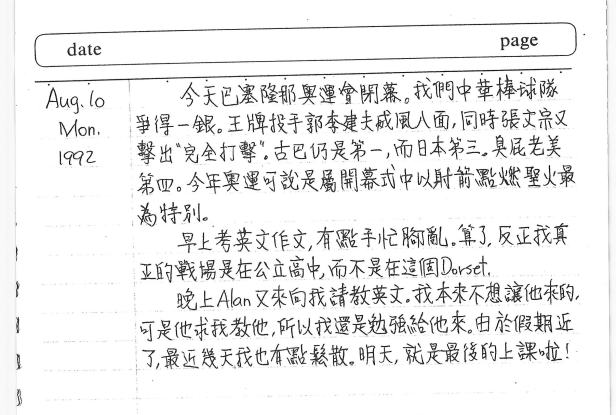 以下是30年前的今天(1992年8月10日)你親筆寫下的日記,請見以下: