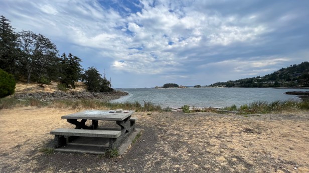 哥哥今天續當導遊,原本建議一個瀑布但還要再開近1小時才會到,太遠,就改成一個叫Neck Point Park,是海灣最凸出海中的尖角,我們有效率,車子直接開到幾乎是那個尖角,此景點1000多個評分評到高達4.8分,哥哥說這邊好多地方都是這麼高評分,大概是來這裡心情都好嗎?這是個灣口,看到對面的別墅,開放的大海,下車,前面直接就是海水,幾個洋人走下去就直接坐在枯木上面抽煙,我們在上面的野餐座位擺好我們藍莓、櫻桃和蘋果乾各一盒,爺爺拍三張照片,海風太烈,10分鐘後又回到車子。