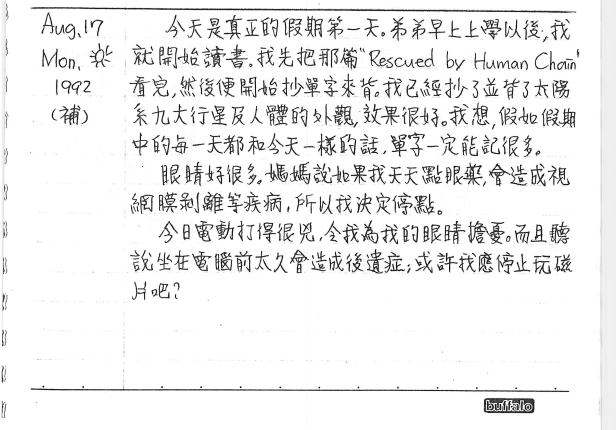 這一天的日記,和我這次為《國語日報》寫的專欄內容很呼應,這是假期的第一天,你放假了,放假在家做什麼事呢?你先用功了,是的,你把一篇英文文章看了,像所有學英文中的人一樣,把單字一一畫下、一一抄,並且還背了「太陽系九大行星」(後來被改成八大行星了)及「人體的外觀」。儘管聽起來也沒背多少字,但你說,這應該是你一年來背單字背最多的一天。