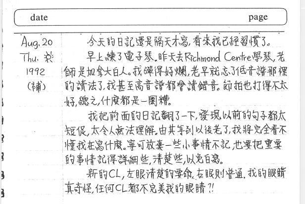 以下是30年前的今天(1992年8月20日)你親筆寫下的日記,請見以下: