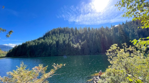第二景,我們去過那麼多湖了,下一個湖應該又長得差不多吧?看到就非常驚訝,在陽光照射下,這個Brohm Lake竟然是深墨黑色的,卻一星點一星點的光跟著流動的湖面、高頻率的閃動著,很亮眼但眼睛可以直視,不會睜不開眼睛。一位老外媽媽早已將小艇充氣好了,泳衣穿好,坐在石頭上,開始吃洋芋片,花掉了20分鐘以後突然「噗通」跳下去了。然後他們家人從旁邊划著船來迎接。遠方的岸邊還有生長得很濃密的水草,我們哪裡都去不了,唯一可做就是去「摸到湖水」,這次的湖水感覺「軟軟的」,沒有很冰,妹妹摸到了水很開心。