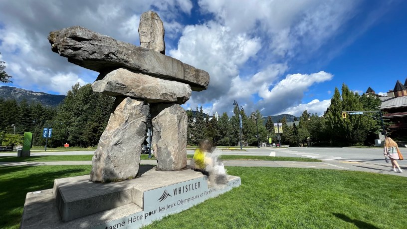我們在10點前checkout,兩個孩子配合著幫我丟了垃圾,我們再走逛這度假村再最後一次,對Whistler上村下村的地形已相當了解,運氣很好的我們又剛好繞到路口、見到那一個「石頭人」,全家可以坐在上面拍照,今天天氣也變好了,度假寓所都是四層樓高,但是天又更高,相機無論怎麼拍,在高山的上面都還有鮮藍色的天空,還有純白色的雲,所以照片裡面都充滿的至少三、四種鮮豔的顏色。太陽很大,卻完全不會熱了,清涼的風一陣一陣的,在戶外走路十分鐘至二十分鐘,全家一起走,沒有比這日子更舒服的,拔下口罩又多一層的鮮味,如果溫哥華的環境已經一百分了,那麼這邊又可以到150分。隨便一走又不小心走到了某棟度假旅館後院的走道,到處都刻意修剪得非常舒適又保持自然,像是一座巨大的奢華花園,到處走都是免費通行,才發現我們走到圖書館後面。