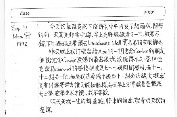 以下是30年前的今天(1992年9月7日)當時15歲的你所親筆寫下的日記:
