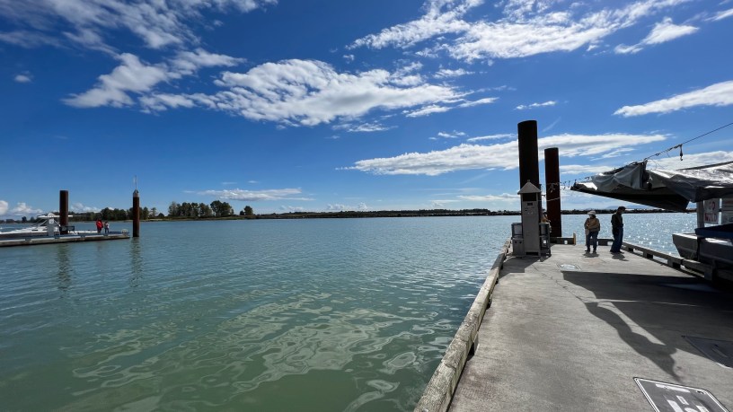 我們接近碼頭,對一艘漁船,買了一籃生鮮的蝦,才10塊錢加幣,原本還想買鮭魚,他們一磅12元和15元加幣,問老半天,原來她指的是一次一定要買一整條,含深黑色的皮,連買一半也不行,我們無法處理,漁夫失望的說:「可是我都已經清過了耶!」