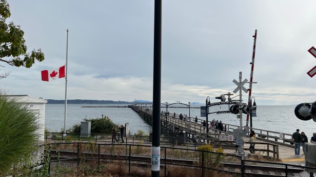 我們也順便拍完今日頭條知識,完成以後,反正就是往東邊開,已經到了8號路、9號路、10號路,進入Surrey,決定往美國邊界走,到了以後,大家都在睡覺,我當然悄悄繞回來「To Canada」,來到白石鎮。以前就說要帶爺奶來,真的帶來了,淺灘不見了,因為漲潮,我們拿起石頭在夕陽下打水漂,參觀兩隻狗一黑一褐色在水裡搶球,還去看了White Rock博物館,看到1917年的本地年輕人男男女女穿泳裝的朋友照片,這些人比我的祖母還要老,現在一定不在世上了,在照片裡卻表情與模樣好像活在2022年今年一樣,突然感到頭暈。