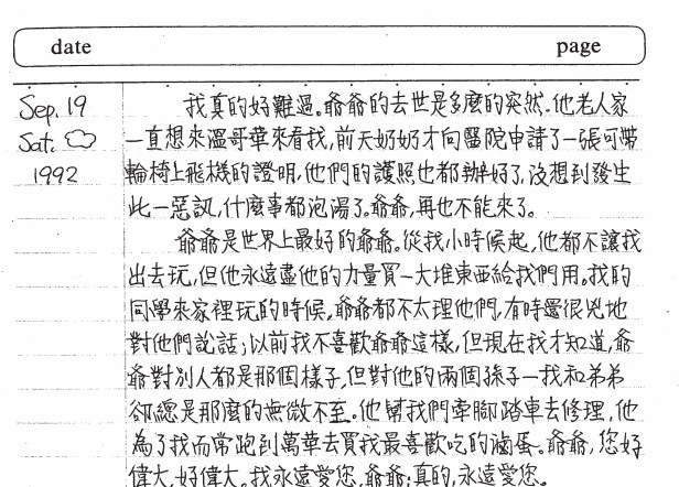 昨天才剛剛遭逢至親爺爺突然過世的你,今天還深陷於無助的難過當中。也經由你打起精神來寫下的日記,30年後的我才能更記得,原來那時候已經向醫院申請了一張可以推著輪椅上飛機的證明,護照也辦好了。或許這是爺爺奶奶第一次出國呢!現在,爺爺突然過世,「什麼事都泡湯了,爺爺再也不能來了」。