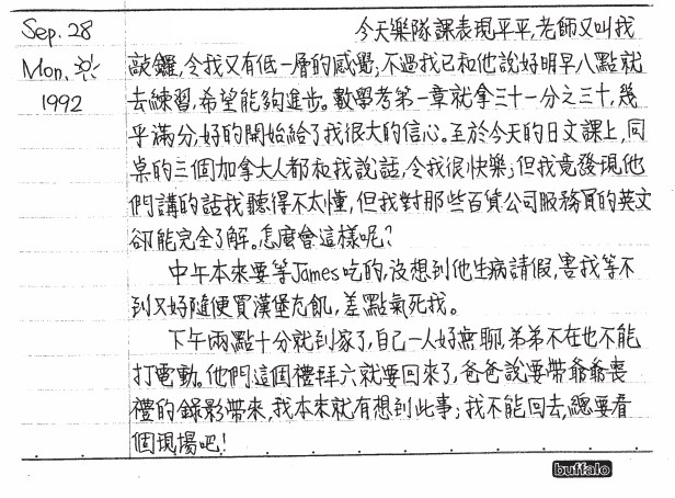 以下是30年前的今天(1992年9月28日)當時15歲的你所親筆寫下的日記: