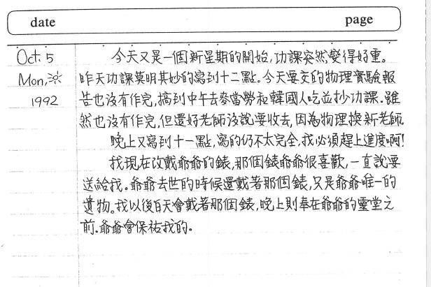 以下是30年前的今天(1992年10月5日)當時15歲的你所親筆寫下的日記: