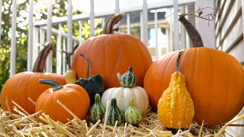 好隊友在我們陽台外面放了剛買的稻草「草磚」,上面擺了上週末摘的大、中、小南瓜,上面的梗還留著,還有好幾個怪形狀的南瓜,好漂亮,另外四顆最小的「Tennessee Dancing Gourd」舞瓜,不敢放窗外,怕烏鴉吃掉。上次在灣邊買薯條,年輕店員直接稱那些烏鴉與海鷗髒話,可以了解為什麼,這些鳥兒搶食物真的野蠻。