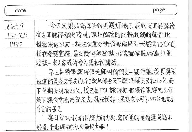 以下是30年前的今天(1992年10月9日)當時15歲的你所親筆寫下的日記: