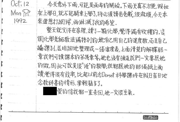 以下是30年前的今天(1992年10月12日)當時15歲的你所親筆寫下的日記:
