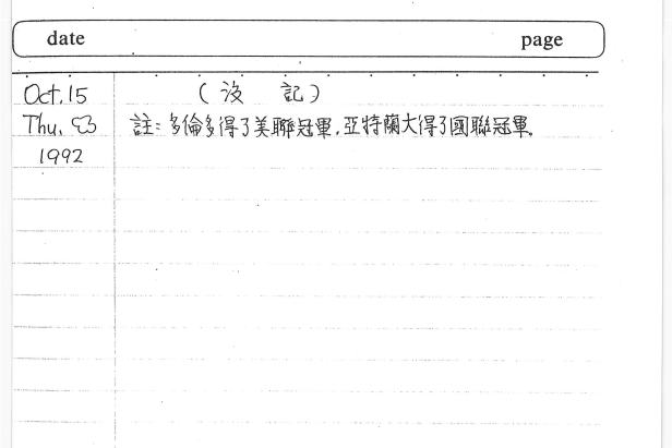 你仍然記下了你認為重要的記事,而那時候的15歲的你,認為最重要的記事竟然就是美國職棒的球隊,誰贏了;你支持的加拿大藍鳥隊Blue Jays贏了美聯冠軍,而厲害投上滿倉的亞特蘭大勇士隊則贏了國聯冠軍,兩軍準備要打世界大賽,你當然是很期待;但在等待兩軍開打前,每一天每一天,你還是要在乎著學校的功課,到底你在學校發生了什麼事呢?
