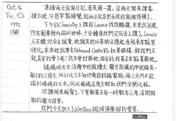 以下是30年前的今天(1992年10月16日)當時15歲的你所親筆寫下的日記: