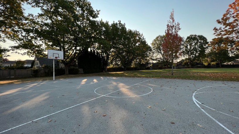 今天的籃球倒打得氣順心暢,陽光是斜的,地上都是松果殼,先來了一群灰色鴿子和加拿大雁,牠們都帶著老小,在草裡啄東西吃,球來了他們呱呱呱的叫,拍打翅膀,移到旁邊一點,球走了,再回來吃。鳥兒走了,換來松鼠,幾隻跳過來;我們四人開始比賽五個定點各投五球共25球,我進了14還16球,命中率有六成,對於很久沒打球來講手感算是不錯;然後打一場比賽再離開,全身的汗水也夠了。我們笑,這四個人打球,每次打完一球,四個人都要「吁…吁…」的彎腰扶著膝蓋來喘氣一陣子,喘完之後才能繼續第二球,萬一和年輕人四打四,年輕人看到這四人就知道是老人了。