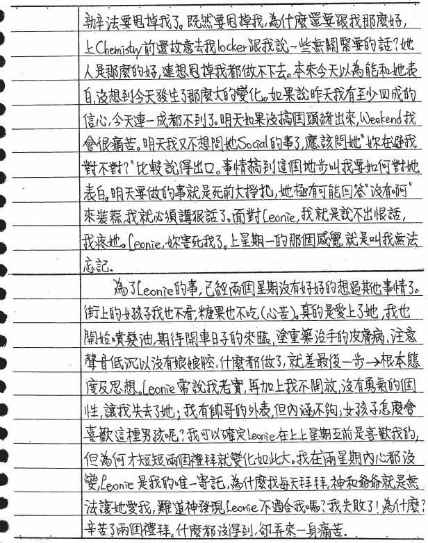 這一天,你的心情記錄系統記上了「E」,表示是最差的心情了,為什麼呢?因為「已經感覺到Leonie完全沒在喜歡我的意思」。發生什麼事呢?竟然只是因為,Leonie不想和你坐在同一桌,反而還去和她同桌的另一個男的新同學聊天,下課時,Leonie趕快「趕」你離開去locker拿東西,你認為是「要甩掉你」。你說,「昨天有四成的信心,今天連一成都不到了」。