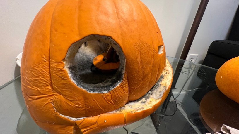 回來看到,南瓜爛掉了,好隊友先發現,大叫,南瓜已經出水了,你們沒發現?孩子尖叫,細看,最大的南瓜,裡面原本純白色的瓜壁已經完全變深黑色的了!孩子們慘叫不已,我戴雙手兩隻手套,好隊友送來大廚餘袋,沒想到防水大袋也漏出「爛水」(是黑色的水),再拿另一大廚餘袋,它又再漏一次,天啊,看來這霉水是有腐蝕性嗎?再又拿出一只大垃圾袋,只有妹妹敢幫忙裝袋,哥哥躲在樓梯上面看──我們笑翻了,這次萬聖節真的印象深刻了,我們已晚了兩星期才刻南瓜,結果,我們的南瓜,還是撐不到萬聖節(明天才是萬聖節)。