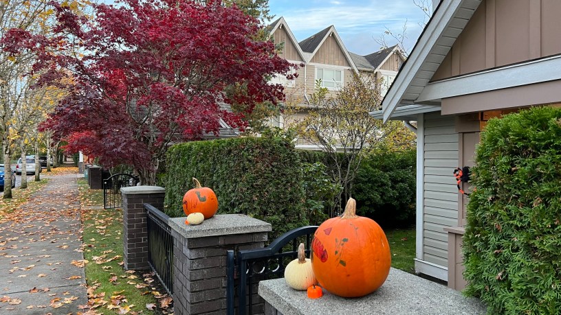 天黑時,確定是晴天的,今晚天氣這麼好,孩子們應該會出門吧?其實萬聖節,在台灣的時候就有過,孩子們在台北上過的幼兒園或小學或甚至補習班都會玩化妝,也會上街要糖,但,歐美的不同處,應該就是可以真正的「待在家裡,有人上門來要糖」的體驗,這是在台灣所沒有體驗過的。這幾天我「說嘴」向孩子們回顧當年住在Richmond家,如何招待上門的Trick or treat的孩子們。