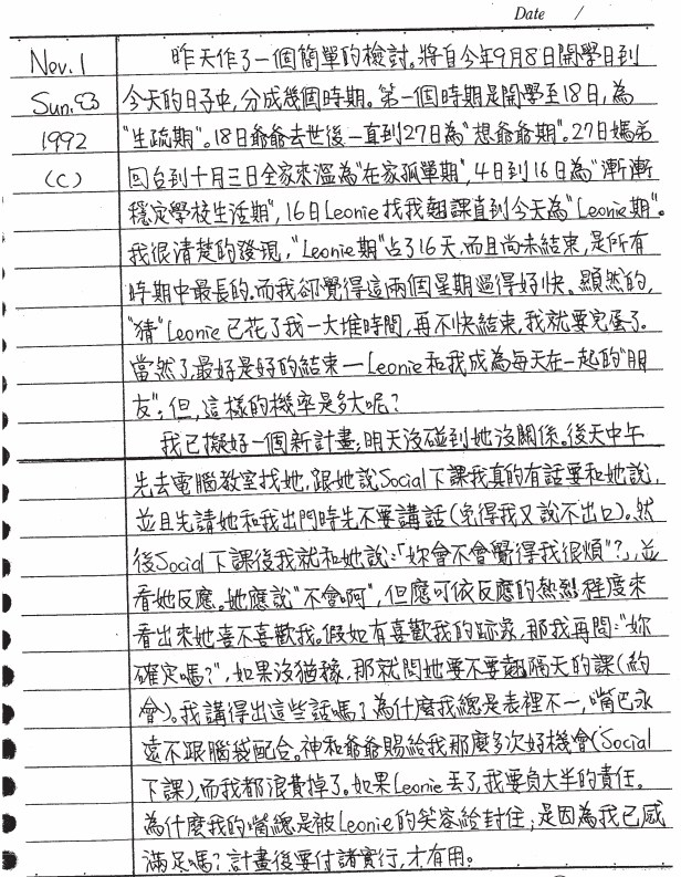 以下是30年前的今天(1992年11月1日)當時15歲的你所親筆寫下的日記:
