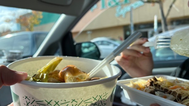 中飯首次嘗試全部買大統華超市的熱食,蝦餃來講,新瑞華餐廳的賣8塊多,大統華的只要5塊半,我們在車上享用,背後是大統華的logo。下午難得來接小朋友們,老地方,之前和還在念另一間學校的妹妹一起等哥哥的地方,我觀察這間學校吐出的同學,我發現,「白人」頭髮較整齊了,走路姿勢比較不怪了,「青蘋果姐姐」改穿全身象牙白的帽T,「紫色頭髮」早就已經變成白色,「大隻佬」還是一樣瀟灑,好像長得又更高一點了,「小隻佬」和以前一樣……我停在第一個位子,上車後,妹妹和我分享今天在學校發生「大事」,家政課有個ABC男生突然暴怒,用椅子對著外國女生砸破了果醬瓶碎滿地。妹妹現在的同學有包括:骨折同學、無聊同學、回家同學三人,三人都是女生,都是大陸人。她說,看起來「回家同學」是最認真的,可見現在她對於一開始認識、最黏她的「骨折同學」(有一天在路邊出車禍致骨折請好幾天假故稱之)已開始不怎麼喜愛了。我開始和妹妹說要如何小心現在在美國很流行的高中槍擊事件,妹妹聽完後又過度的擔心,我又得安慰她,有準備,沒事,且加拿大應該不會發生的。