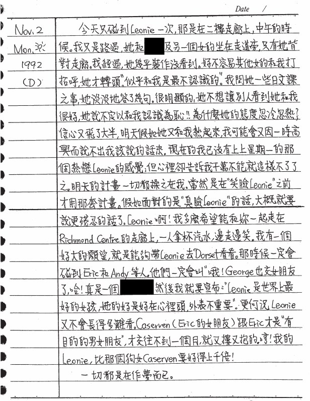 以下是30年前的今天(1992年11月2日)當時15歲的你所親筆寫下的日記: