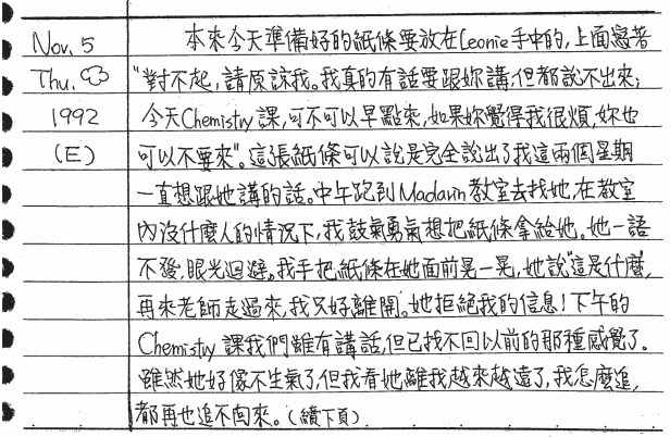 以下是30年前的今天(1992年11月5日)當時15歲的你所親筆寫下的日記: